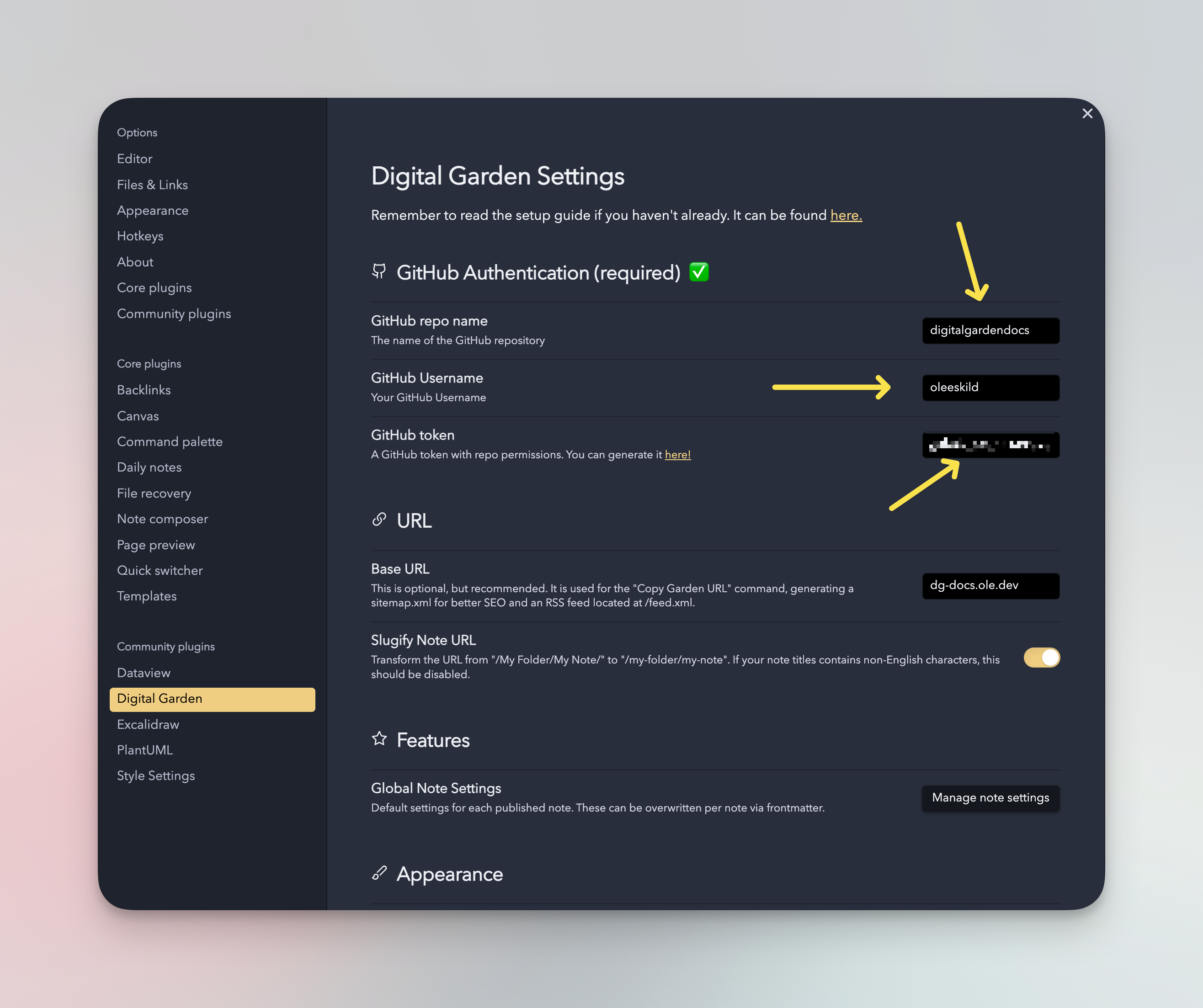 I eventually landed on the Obsidian Digital Garden plugin. It's an Obsidian community plugin that syncs your notes to a self-hosted 11ty site via GitHub. You mark individual notes with a dg-publish: true frontmatter flag, and the plugin handles pushing them to your repo whenever you save. The generated site includes the graph view out of the box.